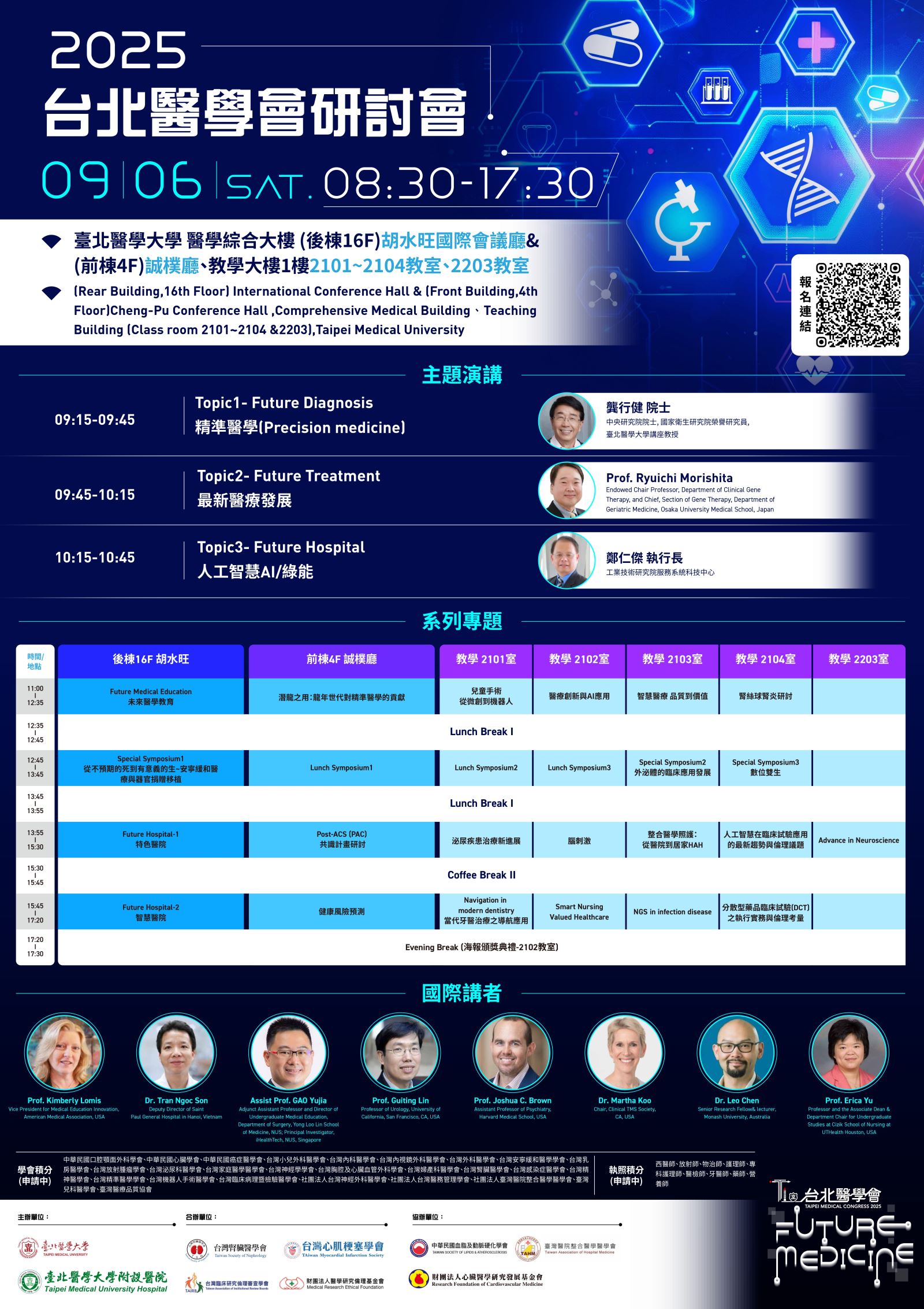 本次以【Future Medicine】為主題,聚焦醫療科技、智慧醫療、精準醫療與跨領域創新應用等未來趨勢,促進醫學知識交流,共同推進醫學專業的進步與社會醫療品質的提升